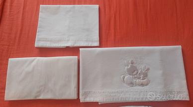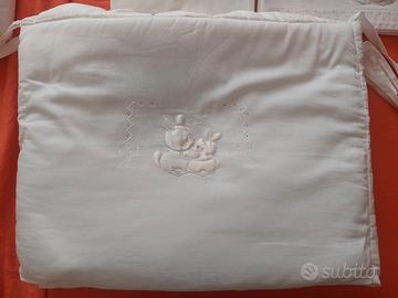 Set completo per lettino (federa cuscino, lenzuolino sotto e sopra, piumino con copripiumino, paracolpi).