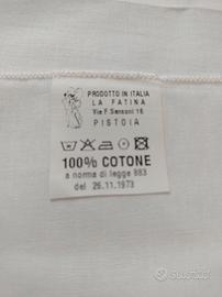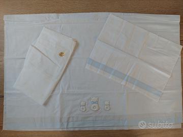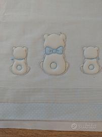 Elegante set da regalo per neonato firmato La Fatina (Pistoia, Italia), realizzato in 100% puro cotone, ideale per culla, lettino e carrozzina. Il set comprende: 1 lenzuolo superiore con inserti celesti e ricamo con tre orsetti, 1 lenzuolo inferiore con angoli (coprimaterasso con elastico), 1 federa coordinata. Prodotto in Italia, a norma di legge 883/1973, rifinito con cura artigianale. Il tessuto è morbido, traspirante e anallergico, perfetto per la pelle delicata del neonato. 💙 Ideale come regalo di nascita, battesimo o decorazione per la cameretta. Colore prevalente: bianco con inserti azzurro chiaro a pois. 🔍 Condizioni: nuovo, mai usato. Sono presenti solo piccolissime pieghe dovute alla conservazione, un lieve alone grigio sul lenzuolino e un lieve alone quasi impercettibile su un bordo, come visibile in foto.