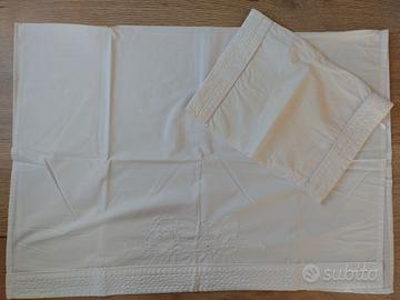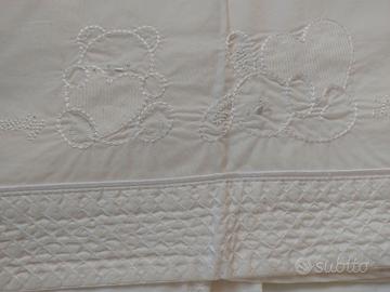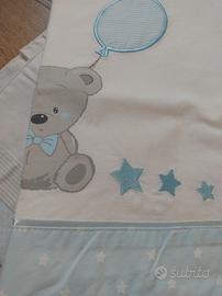 Set tessile per culla, lettino o navicella neonato firmato Prénatal, realizzato in 100% cotone, morbido e delicato sulla pelle del bambino. Il set comprende: 1 completo lenzuolino più federa bianco con fascia azzurra e ricamo orsetto + stelline 1 completo lenzuolino più federa bianco bianco con ricamo in rilievo 1 coprimaterassino bianco senza elastici le misure sono anche nell'etichetta. Condizioni: Ottime condizioni generali. Sono presenti lievi segni di utilizzo/lavaggio e piccole ombre/macchioline leggere visibili in foto, poco evidenti e non compromettono l’uso del prodotto. Nessuno strappo.