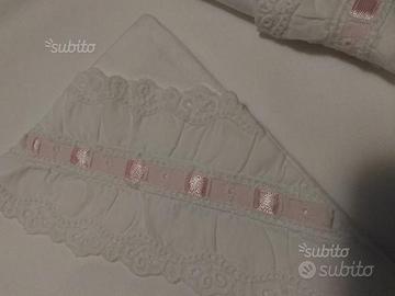 Set 3 pezzi composto da federa, lenzuolo sotto e sopra. Realizzato e cucito interamente a mano con cotone, pizzo sangallo e nasto di raso di ottima qualitá. Disponibile in diverse misure per carrozzina, culla (compatibili con culla Chicco net2me o simili) o lettino. Possibile personalizzare colore e dimensioni. Misure per set carrozzina/culla: lenzuola cm. 75x115 circa federa cm. 28x41 circa. Misure per set lettino: lenzuola cm. 120x180 federa cm. 40x60 circa Disponibile in pronta consegna solo 1 set da carrozzina/culla color rosa, come in foto. Per altre misure/personalizzazioni su ordinazione.