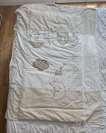 Completo letto: lenzuola sotto, sopra, federa cuscino e piumino invernale con copripiumino per letto in cotone naturale bicolor bianco e beige mélange. Il fronte è decorato con maxi patch di una luna che va in mongolfiera mentre il retro ha le patch di 3 casette da una delle quali si affaccia un orsetto ed un albero.