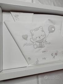 Vendesi elegantissimo completo per culla / carrozzina (3 pezzi) della celebre marca italiana Bruco Bruco. Il set è caratterizzato da un design dolce e delicato, con ricami di alta qualità che ritraggono un tenero gattino con palloncino e dettagli a cuoricino. Il set include: Lenzuolo sopra: Bianco latte con balza decorata e ricamo centrale e con gattino. Federa coordinata: Con richiami ai motivi del lenzuolino. Lenzuolo sotto con angoli: Pensato per aderire perfettamente al materassino della culla o della navicella. Caratteristiche principali: Marca d'eccellenza: Bruco Bruco è garanzia di tessuti sicuri e finiture artigianali per neonati. Materiale: 100% Cotone di alta qualità, fresco e traspirante sulla pelle del bambino. Condizioni: Nuovo mai usato, ancora nella sua confezione originale sigillata. La scatola è integra, ottima anche come idea regalo. Compatibilità: Ideale per culla, navicella (carrozzina) e Next2Me. Consegna a mano zona Cosenza oppure spedizione sicura con tuttosubito.
