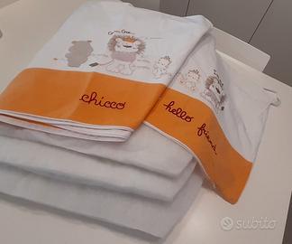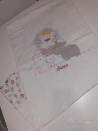 Vendo set completo lettino bimbo/bimba, marca Chicco, tutto coordinato come in foto ed in ottime condizioni/pari a nuovo. Il set è composto da paracolpi lettino, copripiumone, coperta mezza stagione, un set lenzuola completo (lenzuolo, federa e copri materasso) e infine un cambio composto da coprimaterasso e federa, sempre coordinato. I 2 set lettino (coprimaterasso e federa) sono in ottime condizioni; tutto il resto, comprese le lenzuola, sono pari a nuovo. Ho anche il riduttore lettino sempre marca Chicco color arancione chiaro/salmone che si vede nell'ultima foto, coordinato ai colori del set. Disponibili altri prodotti per l'infanzia nei miei annunci.