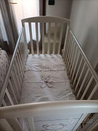 Vendesi set Lettino + Fasciatoio marchio Pali, modello con Orsetto. Colore bianco Compreso nel prezzo: - materasso antiacaro, - paracolpi marchio Pali dello stesso modello con Orsetto, colore bianco. - lenzuolo copripiumino marchio Pali dello stesso modello, colore bianco. Il fasciatoio presenta 3 cassetti, è comprensivo della vaschetta interna per il bagnetto. Non è presente invece il materassino nella parte alta del fasciatoio. Il lettino presenta sotto un cassetto contenitore. Possibilità di vedere Lettino e fasciatoio ancora montati.