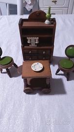 ditta SEVI. Vendo splendido set di mobili in miniatura per casa di bambole o da esposizione, risalente alla seconda metà del Novecento (circa anni '60/'80). Il set è realizzato in legno con una cura del dettaglio davvero notevole e si presenta in ottime condizioni di conservazione. Il lotto è composto da 4 pezzi principali più accessori, tutti in stile rustico/tradizionale con eleganti gambe tornite: Credenza/Vetrina: Alta circa 12-15 cm, con cassetti e ripiani a vista. Carrello/Tavolino: Altezza circa 6 cm, dotato di ruote e piano d'appoggio. Coppia di Sedie: Altezza circa 8 cm, caratterizzate da una particolare seduta verde brillante. Accessori inclusi: Miniatura di lampada a olio verde e piattino decorato in ceramica. Lo stile richiama l'artigianato classico europeo dell'epoca, perfetto per chi vuole arredare una casa di bambole d'epoca o per chi ama il modellismo e l'oggettistica vintage. I pezzi sono integri e pronti per essere esposti. Prezzo per l'intero set: 35 €