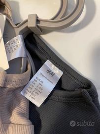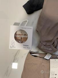 Set Neonato H&M - Body e Pantaloni in Cotone Organico + Scarpine Descrizione: Vendo bellissimo set coordinato per neonato del brand H&M, composto da 5 pezzi totali. I capi sono realizzati in morbido cotone organico (95%) a costine, ideale per la pelle delicata dei più piccoli. Colori neutri e versatili: tortora e grigio antracite. Il set include: • 2 Body a maniche lunghe: Modello a incrocio con bottoni a pressione al cavallo (uno color tortora e uno grigio antracite). • 2 Pantaloni/Leggings: Con elastico in vita e polsini alle caviglie, perfettamente coordinati ai body. • 1 Paio di Scarpine/Babbucce: Nuove in scatola, colore panna/beige con dettaglio "DAD/MUM". • Età: 2-4 mesi. • Altezza: fino a 62 cm.