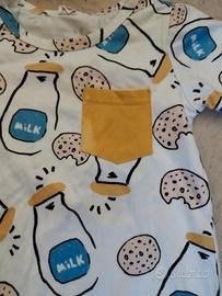 Set estivo come nuovo composto da una tuta con orsetto, un pigiama con una macchia sul taschino, un pantaloncino e 2 costumi da bagno