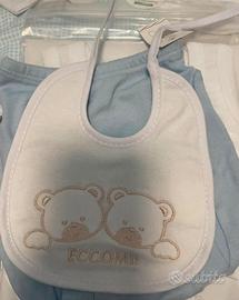 set neonato: due tutine, un body intimo, un copri pannolino, una bavaglia.
