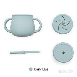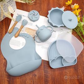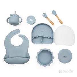 Include piatto con tappo ermetico, ciotola termica con coperchio, posate con manico in legno, bavaglio morbido regolabile e bicchiere con 2 coperchi (cannuccia + anti-soffocamento).