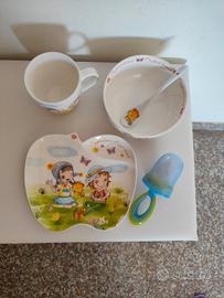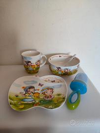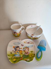 set pappa in ceramica completo con stampa...più contenitore multiplo per pappa o latte in polvere, molto utile quando si vuole portare fuori casa più di un pasto per il neonato...e ciuccio portafrutta per avvicinare il neonato a gustare i pezzetti di frutta in sicurezza...
