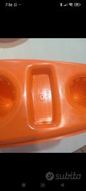 Piatto termico ("Warmy Plate"): Il contenitore bianco con base arancione a sinistra è un piatto progettato per mantenere calda la pappa del bambino. Questo piatto ha un serbatoio che può essere riempito con acqua calda.