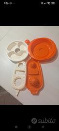 Inserto multifunzione: L'accessorio a destra, con fori e due punte in rilievo, è un inserto per la preparazione del cibo. Le forme a punta ricordano i componenti di un spremiagrumi o di un cuociuova manuale, tipici dei set di svezzamento d'epoca prodotto dal marchio Chicco