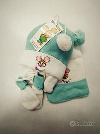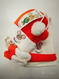 Set per neonati di tre unità. Cappellino con lacci, a maglia doppia, con risvolto e applicazione. Sciarpa con applique. Graffi sul cordoncino. Composizione: 100% acrilico. Colori: arancione, verde, blu, rosa. Nuovo con etichetta e nella confezione originale.