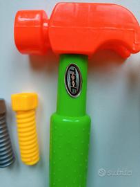 Martello giocattolo coloratissimo: testa arancione brillante e manico verde ergonomico, ideale per incoraggiare il gioco di ruolo e la coordinazione con adesivo Tool.