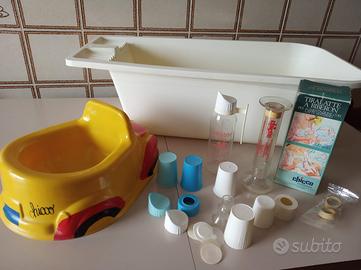 Regalo sterilizzatore Milton a freddo e biberon con accessori. Dispongo anche di bilancia meccanica pesa neonati euro 10 con un altro vassoio utile per la cucina.