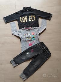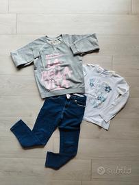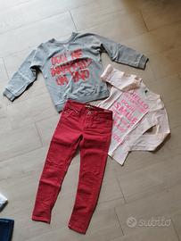 abbigliamento bambina: - 2 felpe marca happiness, con stampa "frase". 2 t shirt manica lunga, Benetton e Primigi. 2 pantaloni: morbido in tela garzata, effetto jeans, regolabile in vita marca chicco. Bordeaux con strappi su ginocchia, marca Please. Perfetti, pratici per la primavera. Veste 6 anni. Unico difetto: alone su manica della maglietta. €12 - abbinamento composto da t shirt grigia con stampa marca Boboli. Felpa con zip e collo montante, grigio melange, stampa dorata, manica 3/4 con risvolto. Marca Benetton. Jeans morbido, regolabile in vita con toppine e finti strappi, marca overkids. Veste 6 anni. Perfetto. €6 - abbinamento composto da maxi felpa-vestito di Monnalisa, linea peanuts, con stampa "materica". Maglietta manica lunga blu, dpam, e jeggings morbido con elastico in vita. Taglia 6 anni. €6 sconti su acquisti plurimi 👍🏻