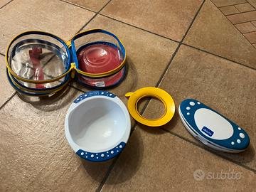 Set prime pappe Chicco anche da viaggio composto da una Tazza raccoglipappa, cucchiaino in silicone, cucchiaino anatomico ed un astuccio portaposate. La tazza può essere inserita nel microonde e può essere fissata l tavolo tramite la ventosa gialla. Lavabili in lavastoviglie