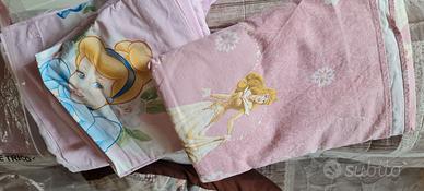 Biancheria da letto e accessori per stanzetta, tutto a tema principesse disney compista da lenzuola, copriletto in cotone, greca, portagiochi richiudibile in stoffa, plastiche catarifrangenti a forme varie e adesivi in plastica rigida.