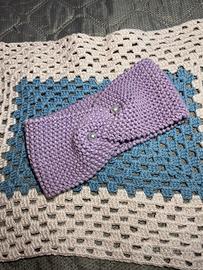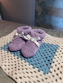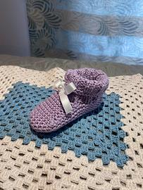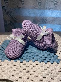 Set - Scarpine neonata con fascia per capelli abbinata fatte a mano con filato 70% cotone e decorate con perline. Indicate per neonata 0-3 mesi.