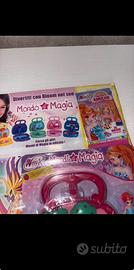 Il prodotto in primo piano è un set contenente un magazine del Winx Club numero 152 e un playset portatile a forma di borsa mai usato e ancora con la confezione originale. Il playset è un "Mondo Magia" portatile, che si apre per rivelare una scena con alberi e una mini-figurina di una fata Bloom. Il set include anche una "Sticker Collection" (collezione di adesivi). #winxclub #set #magazine #collection #nuovoconcartellino #bloom