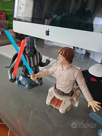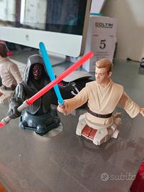 Figure appartenenti a una collezione Kinder Sorpresa (Ferrero) dedicata a Star Wars, uscita originariamente intorno al 2017. Non sono semplici statuine, ma piccoli set di gioco interattivi che ritraggono i duelli più iconici della saga.Design a Mezzo Busto: I personaggi sono raffigurati dalla vita in su, montati su basi che ricordano elementi tecnologici o astronavi (come la parte superiore del Millennium Falcon per gli eroi). Materiale: Plastica rigida con spade laser in plastica traslucida (azzurra per i Jedi, rossa per i Sith).Dettaglio dei Personaggi 1. Il Duello di Naboo: Obi-Wan Kenobi vs. Darth Maul (Foto 1) Questo set rievoca lo scontro finale di Episodio I: La Minaccia Fantasma. Obi-Wan Kenobi: È raffigurato nella sua versione giovane (Padawan), con la tunica beige classica e i capelli corti. Impugna la sua caratteristica spada laser a lama singola azzurra. Darth Maul: Il pezzo forte è il dettaglio del volto tatuato di rosso e nero e le piccole corna sulla testa. Indossa il cappuccio nero sollevato e impugna la sua iconica spada laser a doppia lama rossa. 2. Lo Scontro su Bespin: Luke Skywalker vs. Darth Vader (Foto 2) Questo set rappresenta il leggendario duello di Episodio V: L'Impero Colpisce Ancora. Luke Skywalker: Indossa la divisa beige/grigio chiaro utilizzata durante la missione a Cloud City (Bespin). I lineamenti cercano di riprodurre il giovane Mark Hamill. Darth Vader: La figura è molto dettagliata nonostante le dimensioni, con l'armatura nera lucida, il pannello di controllo sul petto e l'immancabile maschera iconica. Curiosità per Collezionisti Questi pezzi fanno parte di una serie che includeva anche altri personaggi, come Yoda o Han Solo. Sono molto apprezzati Possibile vendita singola o tutti insieme #GuerreStellari #StarWarsItalia #KinderSorpresa #Collezionismo#LaGuerreDesÉtoiles #StarWarsFrance #KinderSurprise #Collectionneur#StarWarsDeutschland #KinderÜberraschung #Sammlung