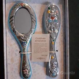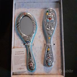 Bellissimo set da neonato spazzola e specchio in lamina d'argento. Un regalo mai usato ancora nella scatola originale. Molto belli e preziosi.