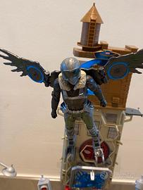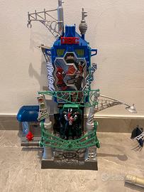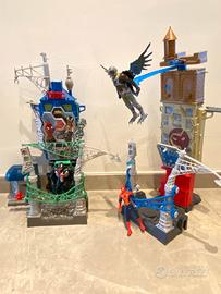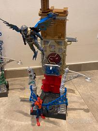doppio set di gioco con personaggi spiderman, DC e Avengers Uomo ragno con elastico si lancia verso i personaggi che vengono intrappolati. spedisco
