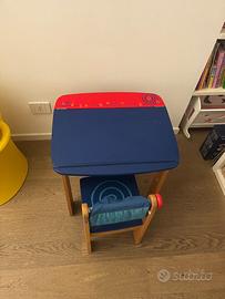 Tavolo in legno con angoli arrotondati e vano porta oggetti dove è possibile posizionare un rotolo di carta per disegnare con la sua sedia in legno mdf e stoffa.