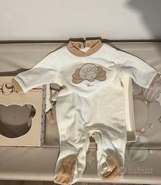 Set Thun composto da tutina, bavetta e calzini in cotone 100% nelle tonalità beige e bianco. Ideale come regalo unisex, con etichetta e confezione originale integra. Possibilità di acquisto separato.