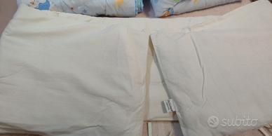 vendo set trapunta + paracolpi double face per lettino con sponde, lavato e mai usato. Regalo in omaggio un secondo paracolpi verde acqua usato ma in buone condizioni. Scatola disponibile ma con qualche imperfezione.