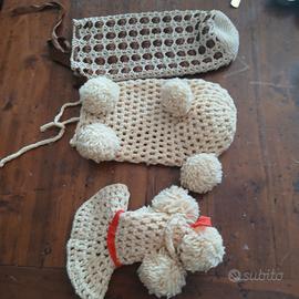 Set di tre sacchetti fatti a mano all'uncinetto, colore beige. - Un sacchetto più grande con nastro marrone. - Due sacchetti più piccoli decorati con pompon e nastrini rossi.