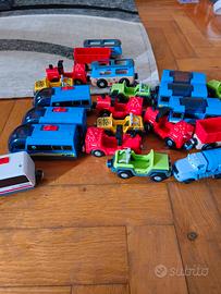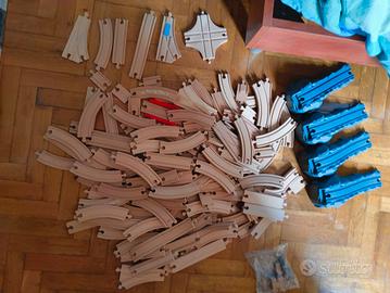 Vendo set trenino giocattolo in legno componibile con moltissimi binari, trenini, personaggi e oggetti vari.