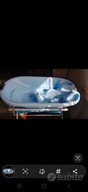 Set completo di ottima qualità per fare il bagnetto ai neonati. Presenti supporto, vaschetta e cestello dove allocarla. La vaschetta può essere usata anche semplicemente a terra mentre il supporto può essere utilizzato anche solo per cambio pannolini. Il supporto è richiudibile tipo stendino per la biancheria quindi dopo occupa poco spazio, purtroppo non posso dire la stessa cosa nel caso dovessi spedirlo perciò preferisco solo consegna a mano.