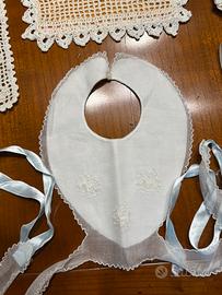 Set vintage composto da : due bavaglini fatti all’uncinetto uno in tulle doppio con ricamo cuffietta con bordino in pizzo 2 fasce ombelicali 1 federa per culla o carrozzine con bordino in pizzo tutto fatto a mano