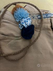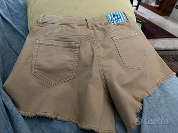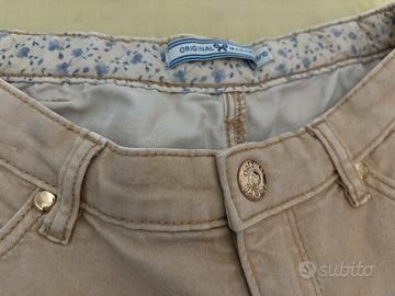 Shorts in cotone elasticizzato modello svasato, con vita regolabile all’interno, cerniera e bottone frontale dorati. Il logo è Miss Original. Il colore è sabbia. La taglia è 9/10 anni. È dotato di due tasche a toppa sia sulla parte frontale sia sul resto del capo. Ha una cintura removibile di corda con quattro fiorellini, uno dei quali riprende la stessa fantasia della parte interna della cintura. La composizione è: 72%cotone, 26%poliestere, 2%elastan. Ottimo stato, come numero. Prezzo: €10,00.