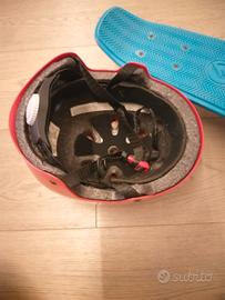 Vendo bello skate in ottimo stato, usato pochissimo e in casa, quindi con le ruote assolutamente integre, per bambino. Misure circa 56x14.5 cm la tavola e circa 58 cm le ruote, marca jamba della decathlon. In regalo caschetto decathlon per bambino, regolabile, in buone condizioni, qualche graffio esterno ma con protezioni interne e cricchetto di regolazione integre.