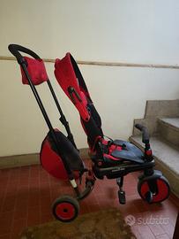 Comodo Triciclo pieghevole con sedile reclinabile e girevole. Permette di cambiare facilmente la posizione del bambino da fronte-strada a fronte-bambino. Cappottina e poggiapiedi bimbo removibili. Cinture regolabili. 2 comodi zaino portaoggetti