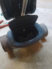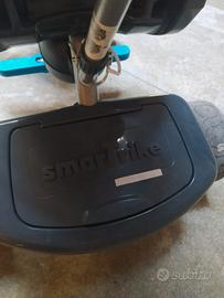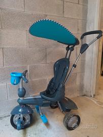 Smartrike con poggiapiedi o pedali. I pedali hanno la possibilità di girare a vuoto oppure di agire sulla ruota anteriore. Piccolo vano porta oggetti. Parasole annesso.