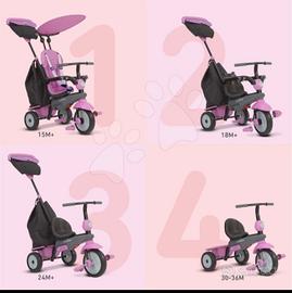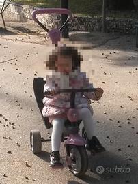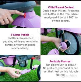 Ha una solida struttura in metallo, cinture e barra di sicurezza, pedali richiudibili e antiscivolo, sistema di blocco e sblocco dei pedali, poggiapiedi removibile, ruote in gomma e con ampio raggio di sterzata, comodo sedile, cappottina parasole, cestello e borsa portaoggetti. Ampio maniglione direzionale ed allungabile: tutto per rendere il triciclo pratico, resistente e facile da utilizzare.