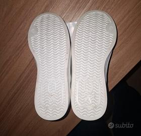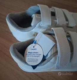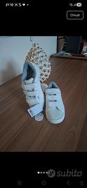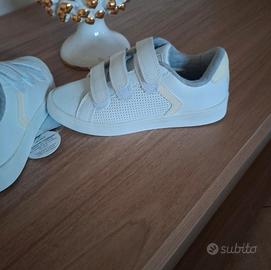 sneakers bianche per bambini presentano una tomaia con tre cinturini in velcro e dettagli traforati sui lati. Colore bianco con inserti beige