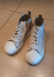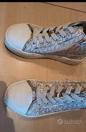 Sneakers alte bambina Michael Kors. Taglia europea 32. Colori: bianco, beige e oro. Chiusura con cerniera (i lacci sono solo da abbellimento). Usate solo una volta per la prima comunione.