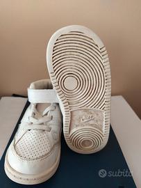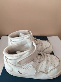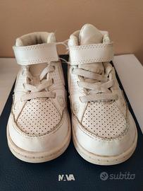 Bianco, pelle, punta tonda, chiusura frontale con lacci, chiusura frontale a strappo, altezza alla caviglia, soletta con logo e suola in gomma.