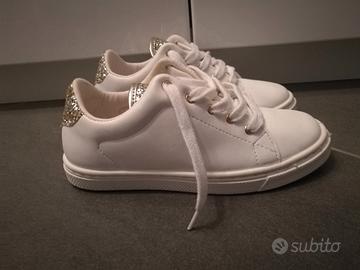 Le scarpe non sono mai state calzate perché passate di misura troppo in fretta perciò sono NUOVE. Sono bianche con glitter dorati dietro e sulla linguetta; la tomaia è in ecopelle e il fondo in gomma antiscivolo.