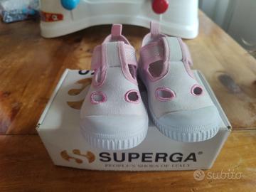 Sandalo primi passi da bimba Marca Giardino dell'oro made in Italy in tessuto con puntale in gomma, sottopiede removibile in vera pelle, suola in gomma e chiusura con fibbia. Usata molto poco. Numero 25