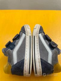 Sneakers primi passi da bambino, in camoscio grigio/blu e doppio strappo, plantare estraibile.