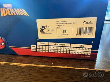 Vendo sneakers bambini con immagine di Spider Man sui lati della scarpa. Con due strappi. Come nuove , usate un paio di volte. N.29