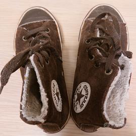 scarpe da ginnastica alte, invernali, marca Converse, modello All Star, n.32. Colore esterno: camoscio marrone. Imbottitura: pelliccia sintetica. Stringhe marroni. #scarpe#calzature#inverno#stivali#stivaletti#pelo#imbottitura#bambina#bambini#bimba#bimbi#