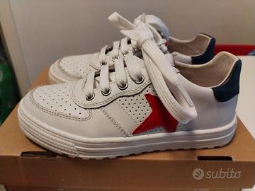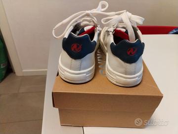 Sneaker in pelle con traforature. Chiusura con lacci e zip laterale. Fodera e soletta estraibile in pelle, fondo a cassetta in gomma. Colore: bianco, rosso e blu. Numero: 30