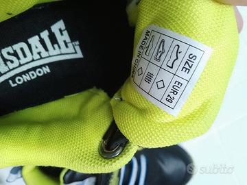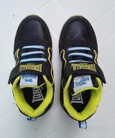 Sneakers da bambino Lonsdale in similpelle nere con dettagli giallo fluo, lacci elastici bicolore, chiusura a strappo con velcro, etichetta logo sulla linguetta, stampe sul lato e suola con luci.