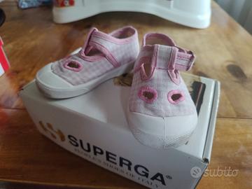 Sandalo primi passi da bimba Superga made in Italy in tessuto con puntale in gomma, sottopiede removibile in vera pelle, suola in gomma e chiusura con fibbia. Usato poco. Numero 20